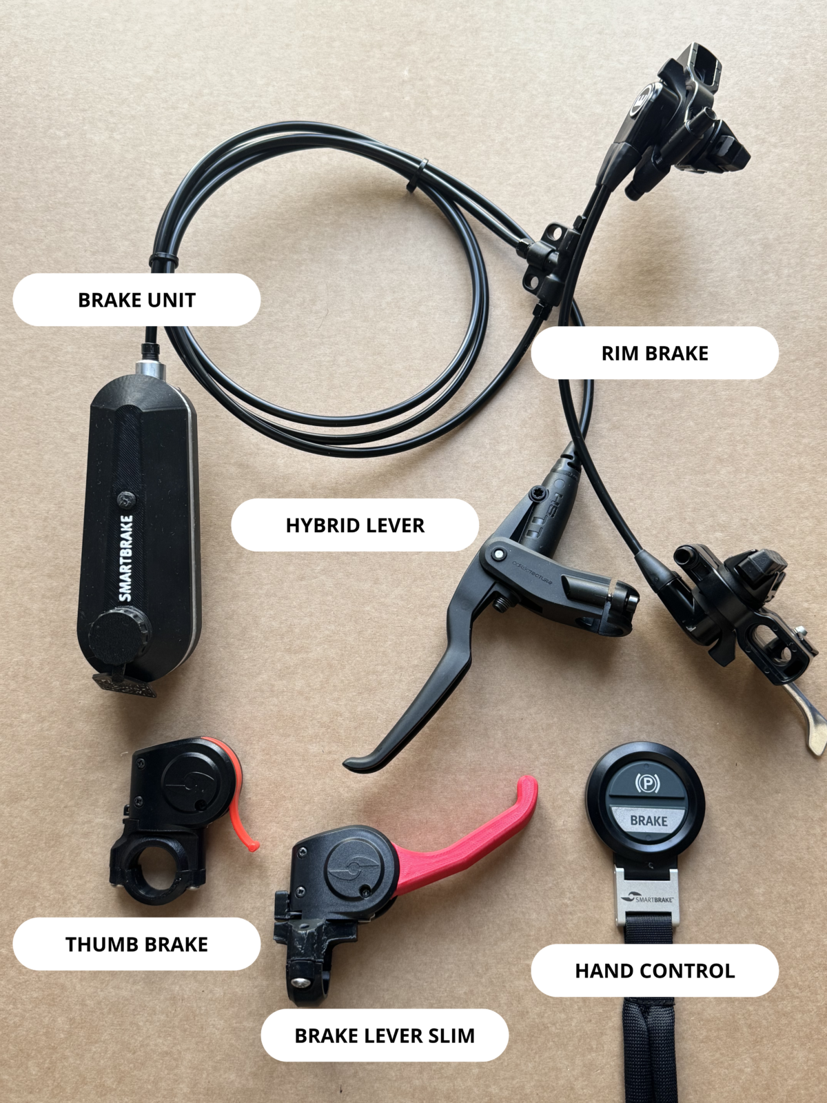 Hvis pakken inneholder en fysisk bremsehendel som er koblet til SmartBrake-bremseenheten, er det et Hybrid-system. Hvis oppsettet kun bruker trådløse kontrollere, er det et Wireless-system.